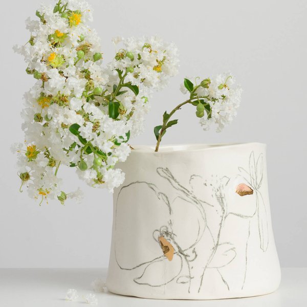 Cachepot da Série Botânica desenhado e trabalhado à mão, em porcelana e ouro. Na Série Botânica os desenhos com o giz cerâmico remetem aos estudos de espécies diversas de flores criadas no imaginário. Um jardim onírico que recebe interferência do ouro.
