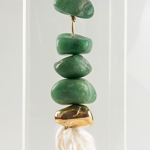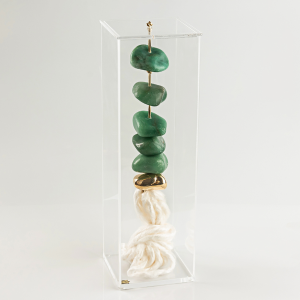 A Caixa de Acrílico G Quartzo Verde e Seda é um artigo decorativo que celebra o encontro entre natureza e design. Produzida em acrílico transparente de alta resistência, traz em seu interior pedras de quartzo verde e dourado envoltas por uma corda de seda natural, compondo um visual sofisticado e cheio de significado.