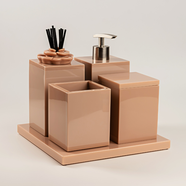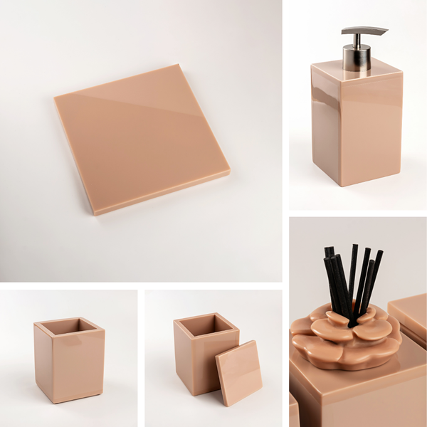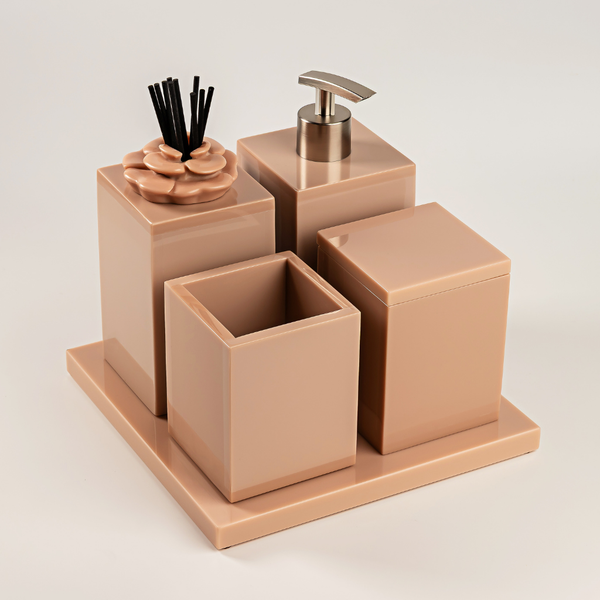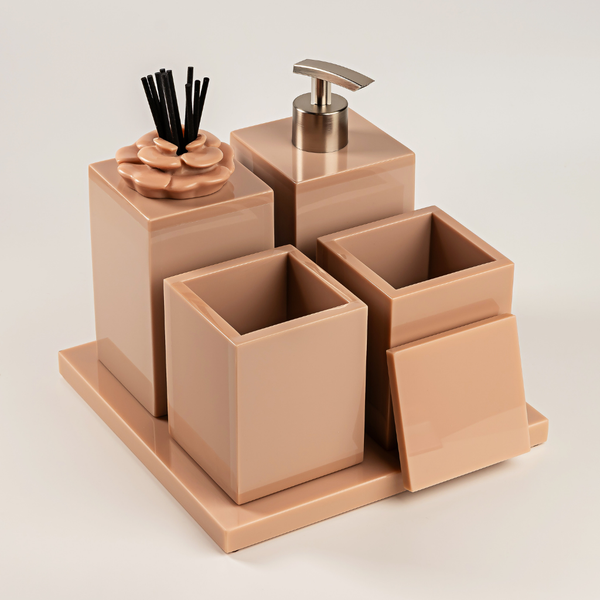 O Conjunto Camélia V é a definição de elegância funcional. Composto por base quadrada, difusor, dispenser, porta acessório e cubo baixo, transforma o cuidado pessoal em um verdadeiro ritual de beleza. Seus elementos unem formas sofisticadas e versáteis, ideais para valorizar penteadeiras e bancadas de banheiro. Em tons off-white ou camel, a coleção Camélia se destaca pela delicadeza atemporal e pela harmonia com diferentes estilos de décor. Mais que um conjunto, uma experiência de cuidado com charme e refinamento.