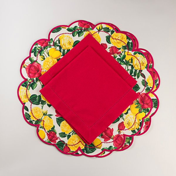 Conjunto com 2 Jogos Americanos Roses e 2 Guardanapos que combinam elegância e frescor para sua mesa posta. Os Jogos Americanos Roses, em poliéster, apresentam estampa floral vibrante com rosas amarelas, pink, folhas e limões sicilianos sobre fundo branco, com acabamento em tom pink que adiciona charme à composição. Os Guardanapos, confeccionados em linho ou linho misto, são ideais para compor mesas clássicas ou contemporâneas, são a escolha perfeita para ocasiões especiais, unindo beleza, praticidade e durabilidade.