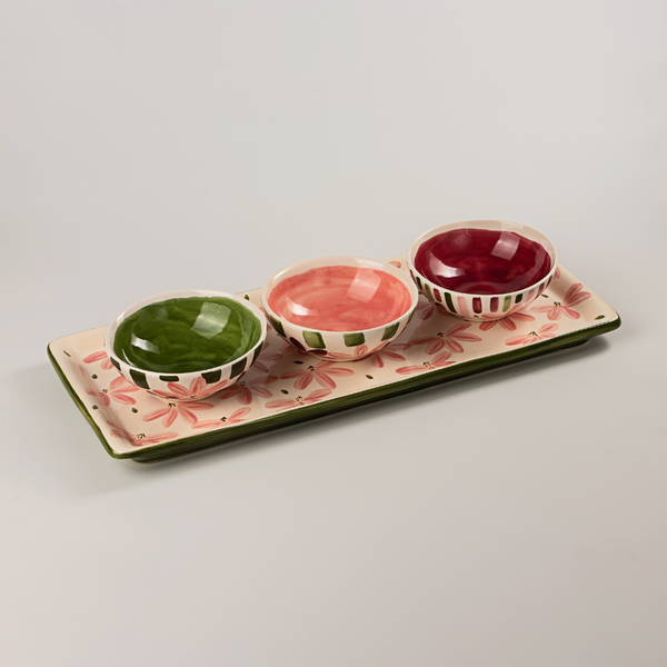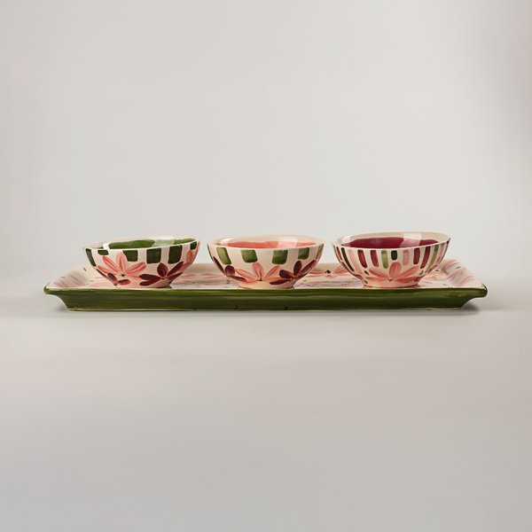 O Conjunto de Petisqueiras Blossom transforma cada recepção em um momento especial. Composto por uma peça retangular e três redondas menores, todas em cerâmica artesanal, pintadas à mão com delicadas flores em tons de rosé, bordô e verde, ele celebra o encantamento dos pequenos gestos. Uma ode à arte de servir com afeto — onde cada detalhe conta.