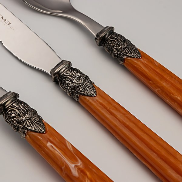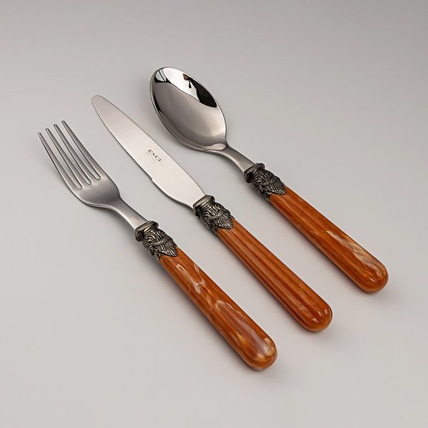 Seus cabos em tom caramelo, com efeito marmorizado e veios suaves em relevo, trazem calor e textura às composições. Cada peça é feita em aço inoxidável 18/10 com acabamento polido espelhado, e a ponteira cinzelada une-se à parte superior com precisão e delicadeza. O contraste entre o brilho do metal e a tonalidade terrosa do acrílico cria uma estética sofisticada e acolhedora.