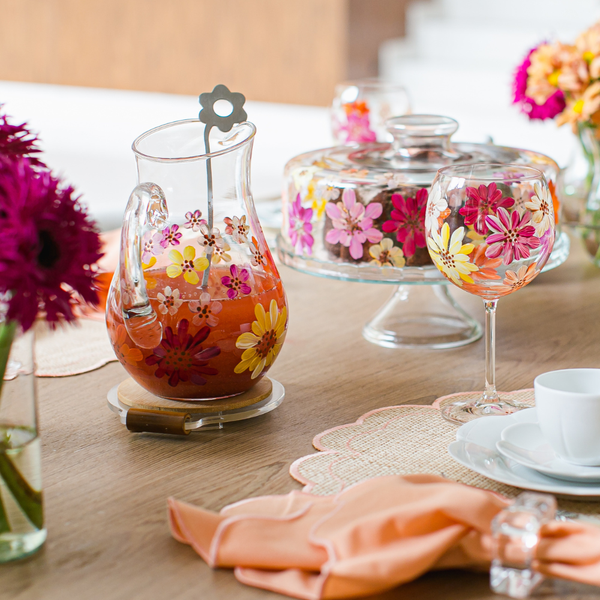 Delicada e encantadora, a Jarra Gérbera traz o charme das flores para sua mesa ou decoração. Feita em vidro transparente, ela se destaca pelas gérberas pintadas à mão, que conferem um toque artesanal e cheio de personalidade à peça. Perfeita para servir bebidas com elegância ou para ser usada como vaso, levando leveza, cor e frescor ao ambiente. Uma peça versátil, que combina com composições descontraídas ou sofisticadas, sempre adicionando beleza e naturalidade ao seu espaço.