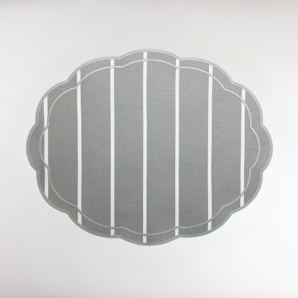 Lugar americano oval recortado e com acabamento bordado, em tecido nas cores azul marinho, cinza e mostarda, com listras brancas e com bordado e acabamento na cor mesma cor do tecido.