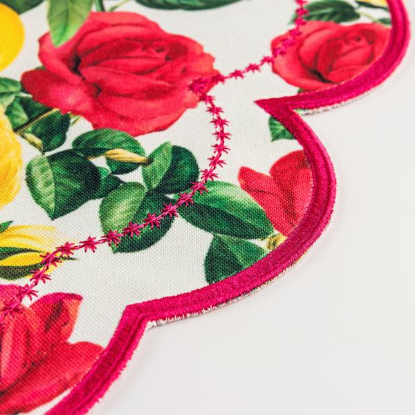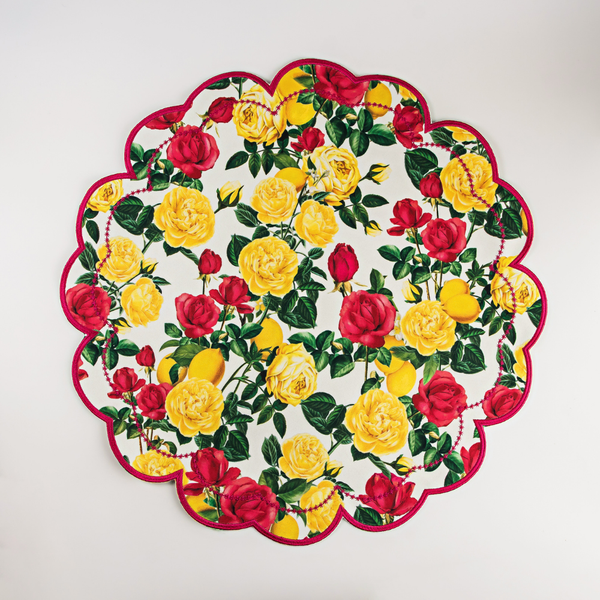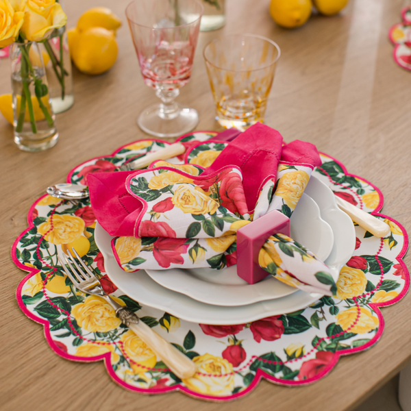 Delicado e vibrante, o Jogo Americano Roses traz um toque floral sofisticado à sua mesa. Confeccionado em tela de poliéster, destaca-se pela estampa exuberante de rosas amarelas, rosas pink, folhas e limões sicilianos sobre fundo branco. Os acabamentos e bordados em tom pink acrescentam charme e elegância à composição, fazendo deste jogo a escolha ideal para refeições alegres e cheias de estilo.