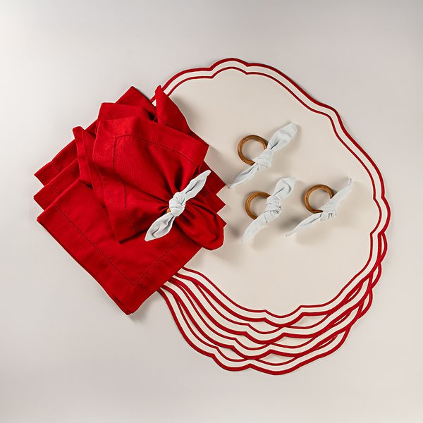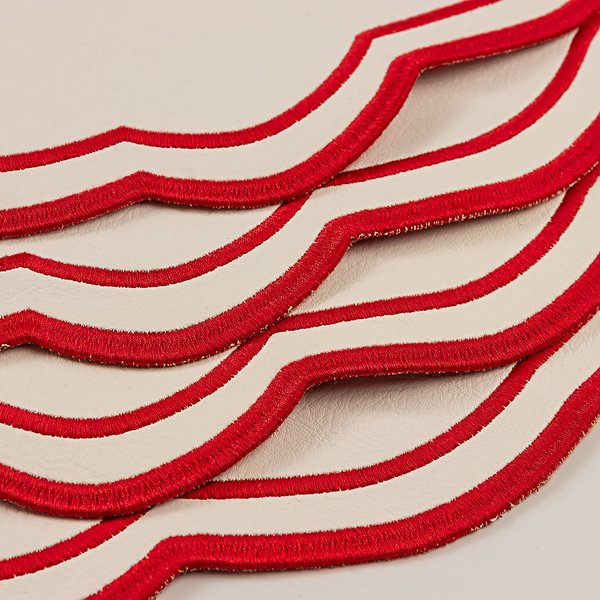 O Kit Barcelona Vermelho reúne elegância, exclusividade e cuidado em cada detalhe. Composto por 4 jogos americanos em couro ecológico branco com acabamento vermelho, 4 guardanapos Ajour em linho misto e 4 porta-guardanapos Laço na cor branca, ele transforma a mesa posta em um ritual de beleza e aconchego. O acabamento artesanal, o bordado delicado e o design autoral criam harmonia entre sofisticação e afeto - perfeito para celebrar momentos cotidianos ou ocasiões especiais. Acompanha embalagem para presente.