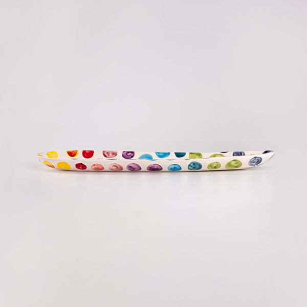 A Petisqueira Canoa Big Dots é uma adição vibrante e funcional à sua coleção de utensílios domésticos. Feita em cerâmica, esta petisqueira apresenta um design elegante em formato de canoa, perfeito para servir uma variedade de petiscos de forma organizada e charmosa. Cada peça é cuidadosamente decorada com bolas redondas pintadas à mão, adicionando um toque de cor e estilo único à sua mesa. Ideal para entreter amigos e familiares em ocasiões especiais ou simplesmente para alegrar o dia a dia em casa, esta petisqueira é tanto prática quanto encantadora.