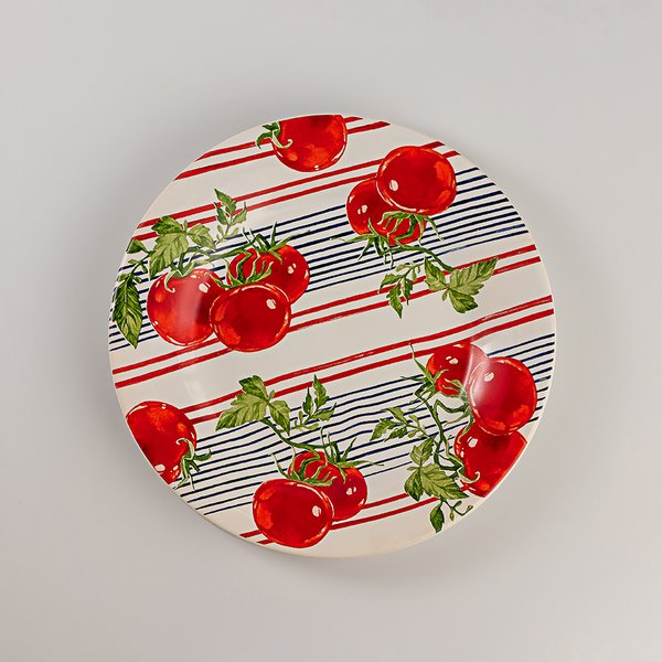 Leve elegância e charme à sua mesa com o Prato de Sobremesa Pomodori. Este prato é feito em cerâmica faiança, conhecido por sua durabilidade e acabamento refinado. Com um design exclusivo, ele apresenta delicados ramos de tomates combinados harmoniosamente com listras azuis escuras e vermelhas, trazendo um toque de sofisticação e frescor a qualquer refeição. Perfeito para servir sobremesas com estilo, o Prato de Sobremesa Pomodori é uma escolha ideal para quem valoriza beleza e funcionalidade. Transforme suas ocasiões especiais em momentos inesquecíveis com este elegante prato.