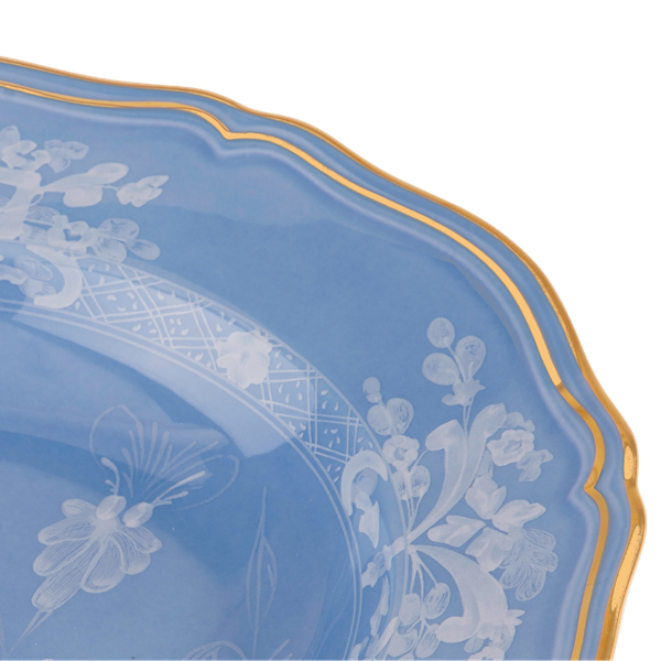 Apresentamos o Prato Fundo Oriente Italiano Pervinca da renomada marca Richard Ginori, uma peça de refinada porcelana no formato clássico Antico Doccia, na cor azul pervinca, com uma delicada decoração em branco e embelezada com um distintivo fio de ouro puro.