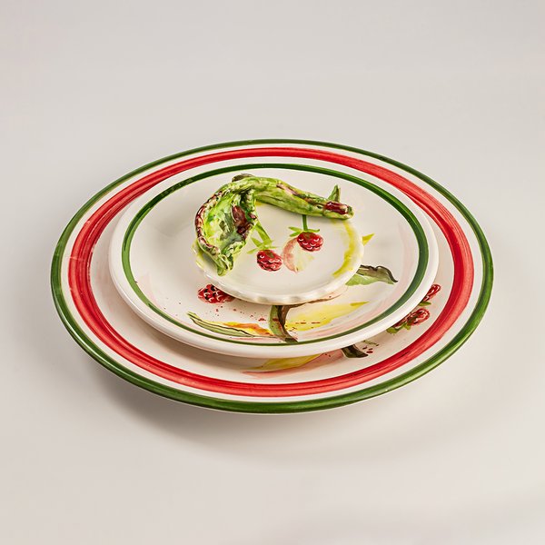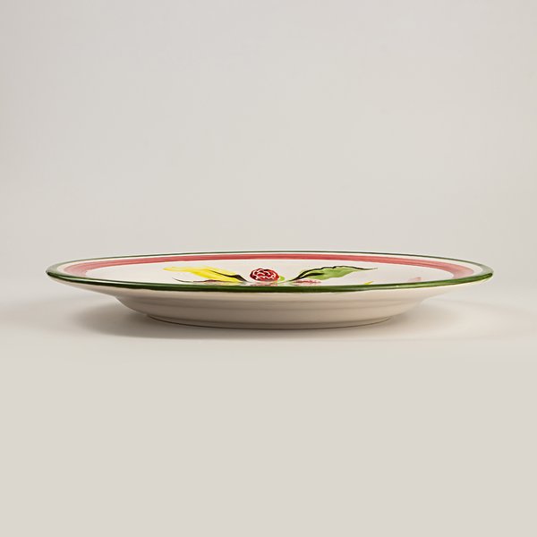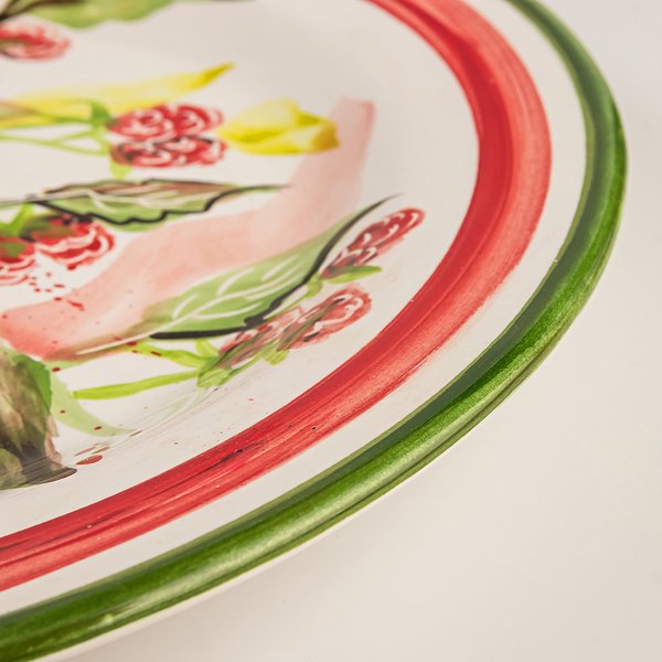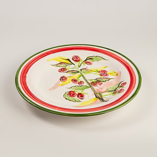 Prato raso em cerâmica com desenhos de framboesas pintados à mão.