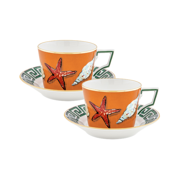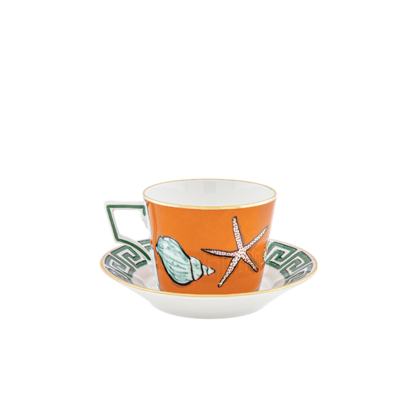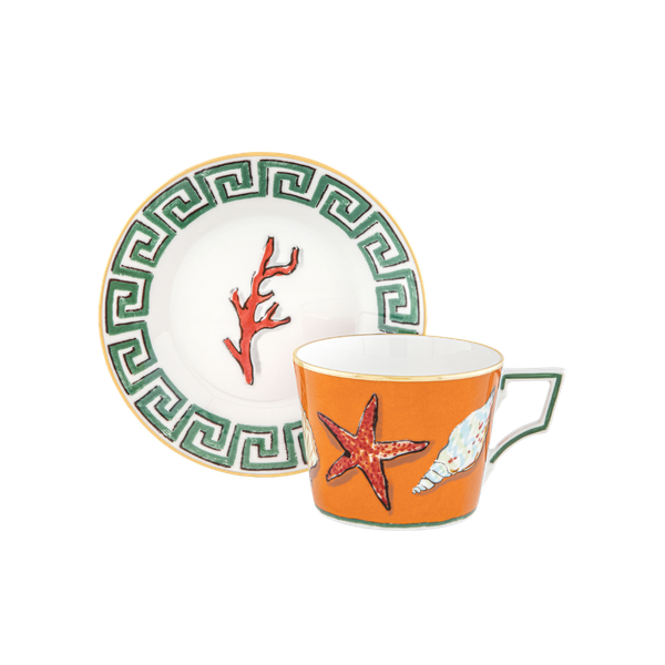 Descubra a elegância e o encanto do Set de 2 Xícaras de Chá Il Viaggio di Nettuno Rock Orange - Richard Ginori. Feitas de porcelana fina, estas xícaras e seus pires exibem um contraste sublime: o laranja profundo das xícaras ressalta contra o delicado padrão verde grego dos pires. Um fio de ouro puro realça as linhas clássicas, conferindo uma aura de luxo e sofisticação. A decoração, meticulosamente detalhada, apresenta estrelas do mar, conchas e corais, evocando a lendária jornada de Netuno às profundezas. Esta coleção exclusiva, Il Viaggio di Nettuno, é fruto da colaboração entre a renomada Richard Ginori e o talentoso designer inglês Luke Edward Hall, cuja paixão pela mitologia greco-romana inspira cada peça, imortalizando a magia e o mistério do oceano em sua forma mais refinada. A Richard Ginori, fundada em 1735 em Doccia - Florença, cuja tradição é transformar porcelana em pura beleza, é uma expressão de excelência na Itália e no mundo na alta manufatura artística de porcelana.Desperte seus sentidos e embarque nessa viagem extraordinária com cada gole de chá.