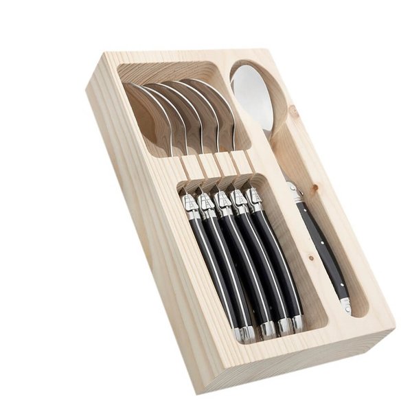 Conjunto de 6 colheres em aço inoxidável de altíssima qualidade da Marca Laguilo La Tour com cabo em ABS. O conjunto de colheres está acondicionado em uma elegante bandeja de madeira. Toda a tradição das peças Laguiole é encontrada nesta linha.