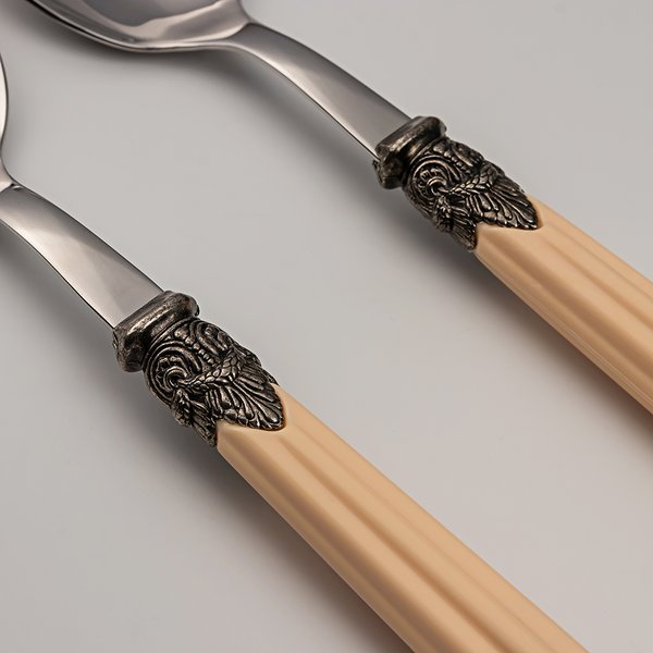 Conjunto para salada da Linha Versailles da marca italiana EME (sigla de Egidio Mori Elio), marca italiana que surgiu em 1974 e desde então exporta para todo o mundo. A marca italiana é reconhecida pela excelência e alto padrão em seu trabalho com metal e pelos cabos de acrílico colorido que se tornaram febre no mundo todo. Versailles é uma linha de talheres inspirada nos clássicos. Os cabos com efeito marmorizado e com veios em relevo, possuem pontas arredondadas. As formas também são destacadas pela ponteira finamente cinzelada que se une à parte superior em aço polido espelhado. As ponteiras decoradas conferem a este modelo de talheres um visual clássico, tornando-o perfeito para quem busca elegância para levar à mesa. De Lumezzane para a FerDan e diretamente para a sua mesa posta, uma escolha para transformar por completo o seu enxoval.