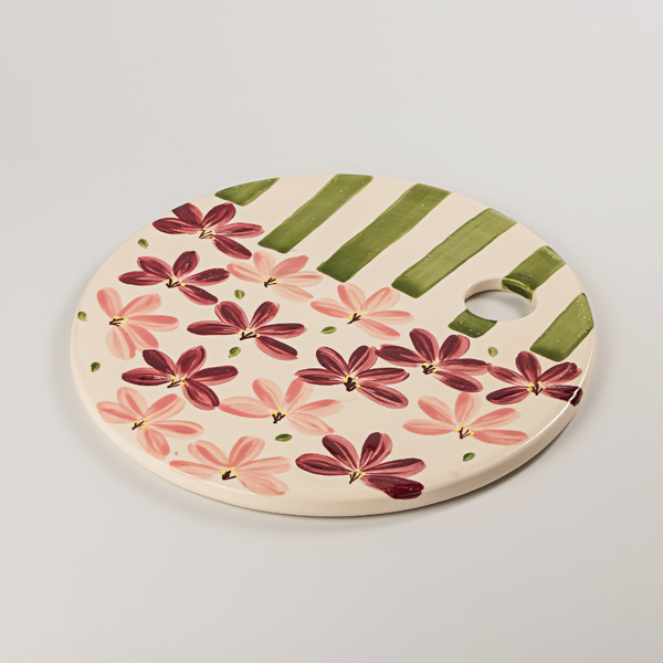 Delicada e marcante, a Tábua de Frios Blossom une arte e função em cada traço. Feita em cerâmica e pintada à mão, revela flores e listras em tons rosé, bordô e verde — uma paleta que acolhe e encanta. Ideal para receber com charme e imprimir personalidade à mesa, é uma peça autoral que transforma qualquer momento em celebração. Porque na FerDan, vida nos detalhes.