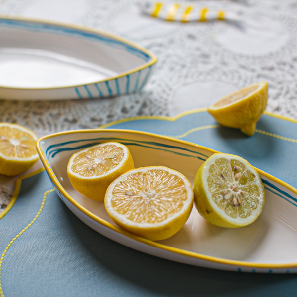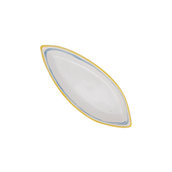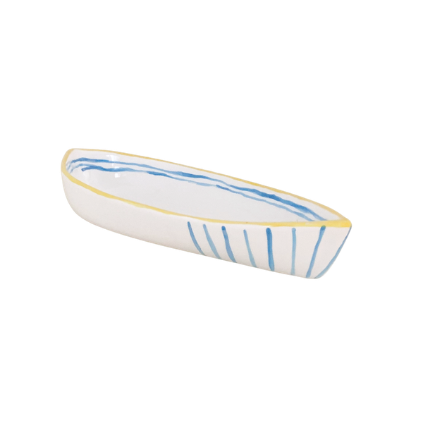 Travessa em cerâmica com formato de barco, com listras azuis e a borda amarela, pintados à mão.