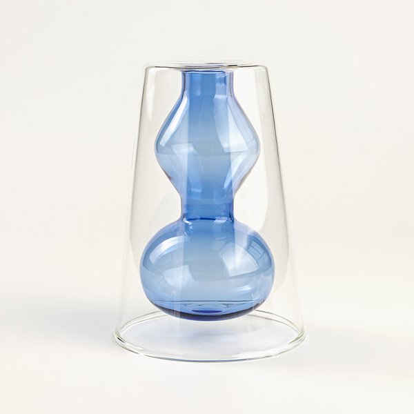 Vaso de vidro soprado à mão na cor translucida e com vaso interior em formato de esfera e losango na cor azul.
